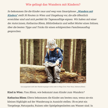 Katharina Bliem, Autorin dieses Blogs und des Buches „Wandern mit Kindern“, wurde für den Newsletter „Kind in Wien“ interviewt. Wir präsentieren einen Auszug aus dem Gespräch … Mehr Interview im Falter-Newsletter „Kind in Wien“